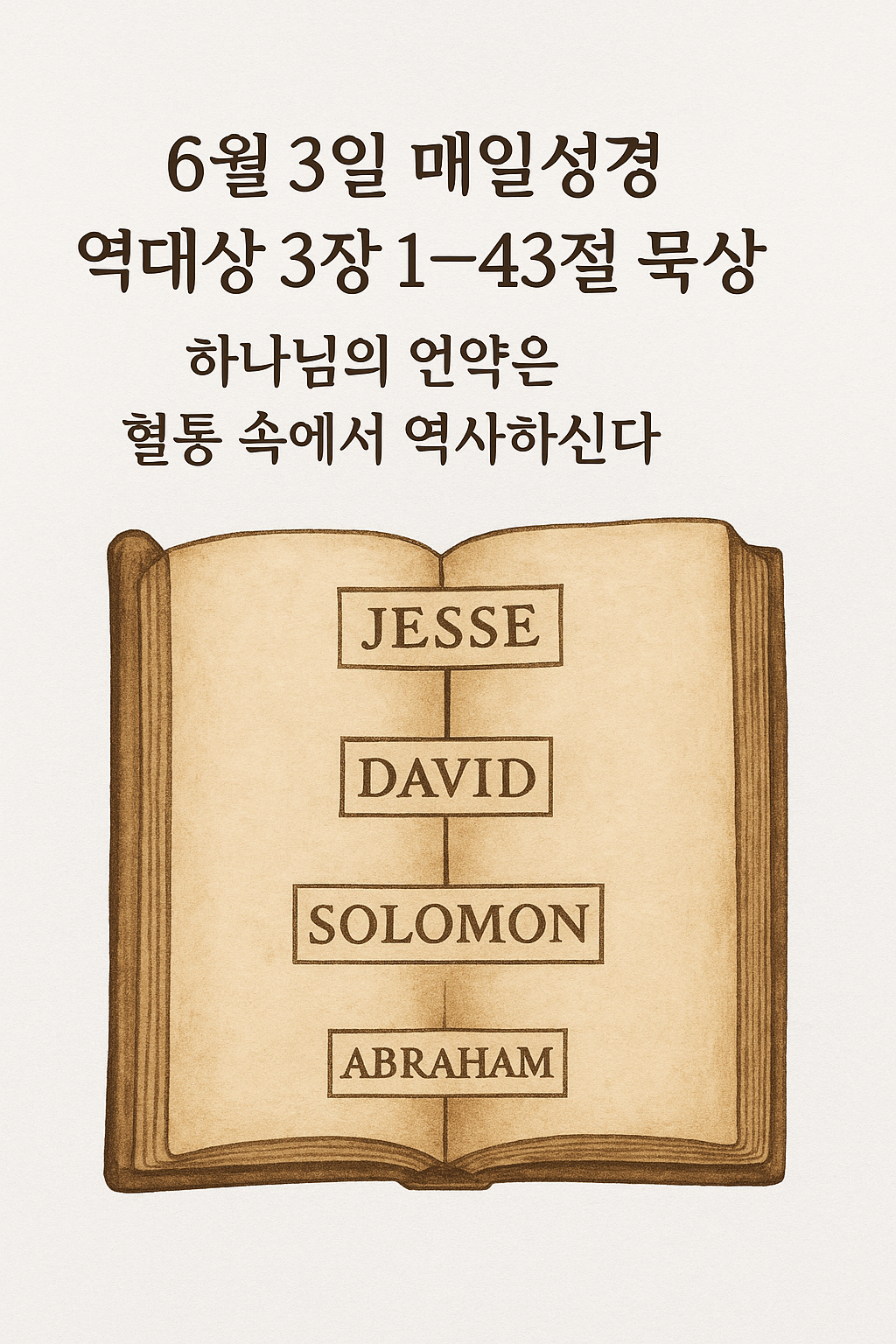 2025년 6월 3일 큐티 본문은 역대상 3:1–4:43으로, 다윗 왕의 계보부터 유다와 시므온 자손의 역사까지 이어지는 긴 족보입니다. 하나님은 이름 속에서 역사하시며, 포로기 이후에도 언약을 이어가십니다.