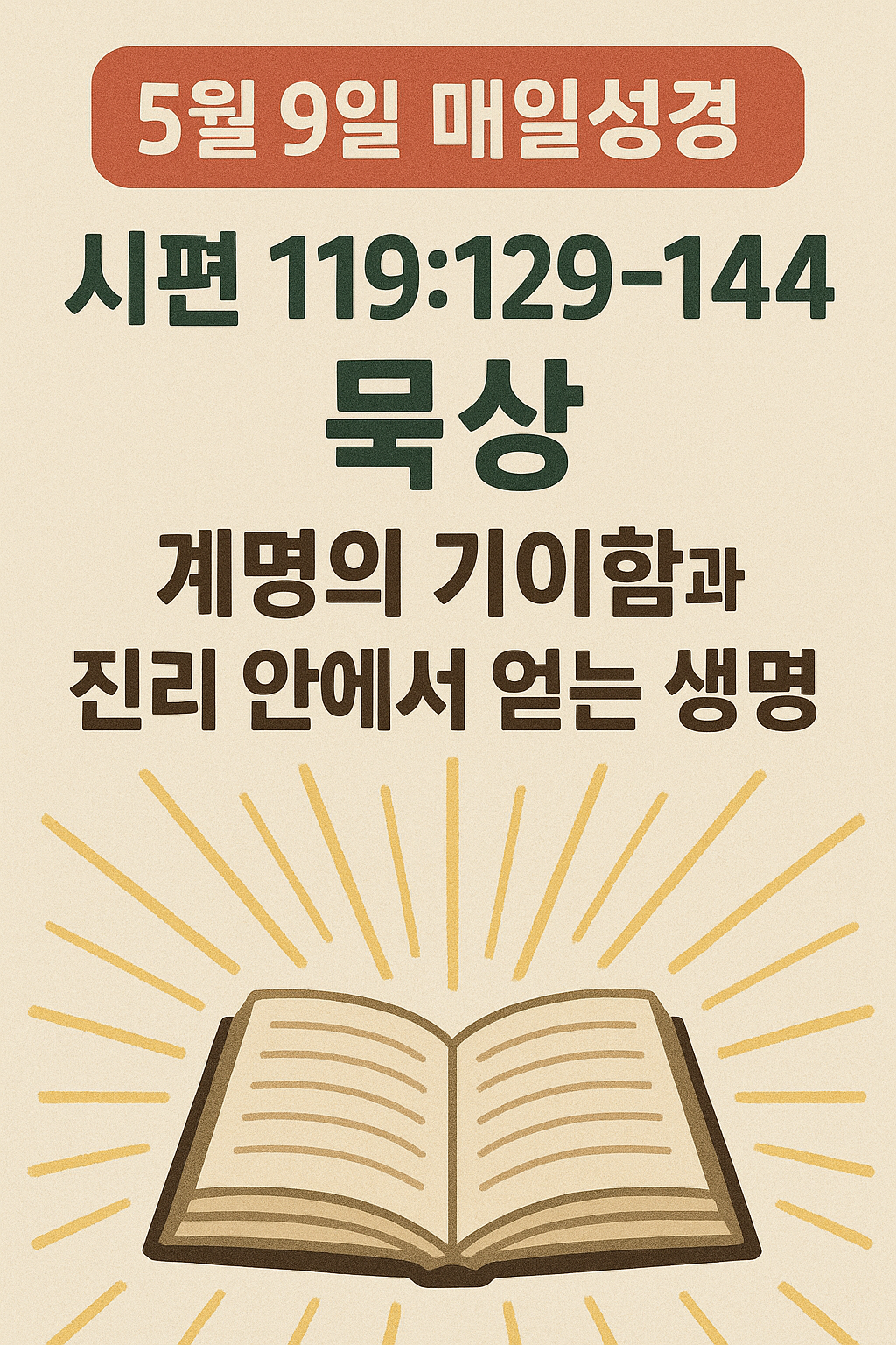 2025년 5월 9일 매일성경 큐티 본문은 시편 119편 129-144절입니다. 시편 기자는 하나님의 말씀을 “기이하다”고 고백하며, 말씀이 단순한 정보가 아니라 영혼을 밝히는 빛, 고난 속에서 희망을 주는 생명, 세상과 구별된 참된 기쁨과 정의의 기준임을 드러냅니다. 이 묵상에서는 각 구절의 깊이를 충실히 반영하여, 묵상과 실제 삶의 적용이 만나는 통찰을 함께 나눕니다.